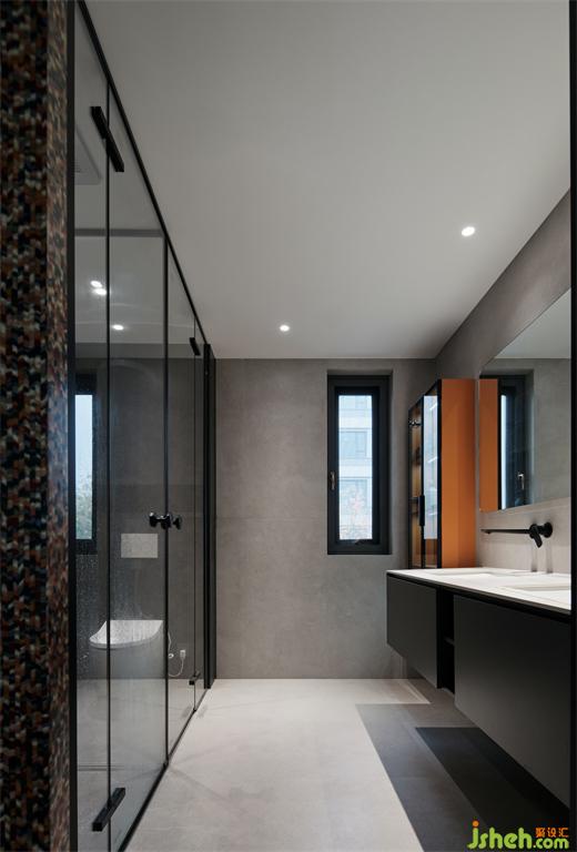 衛(wèi)生間的地面和墻面采用了大塊的灰色柔光磚,有一種“微水泥”的高級(jí)感,不僅美觀,還自帶防滑效果,增加空間的安全性。