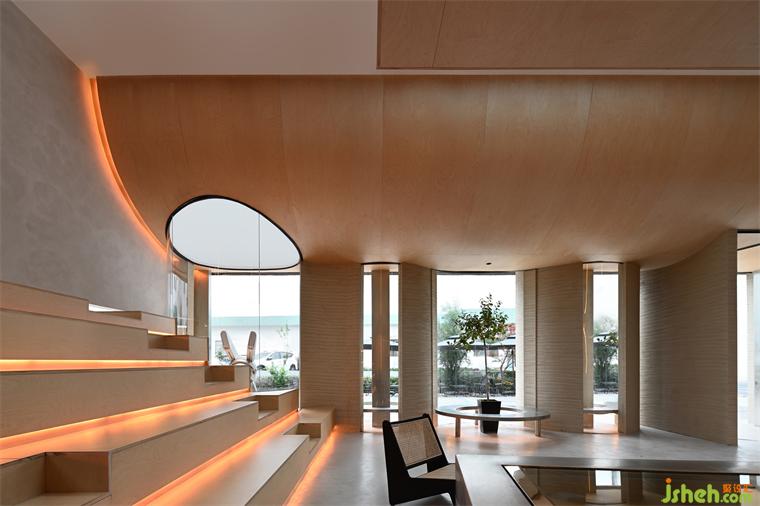 受音樂劇場啟發(fā),設置小面積梯臺狀坐臺,咖啡廳設計以符合人體工程學的階梯高度搭配溫潤樺木。