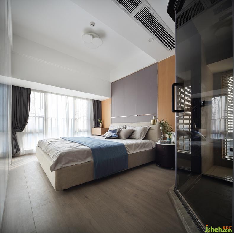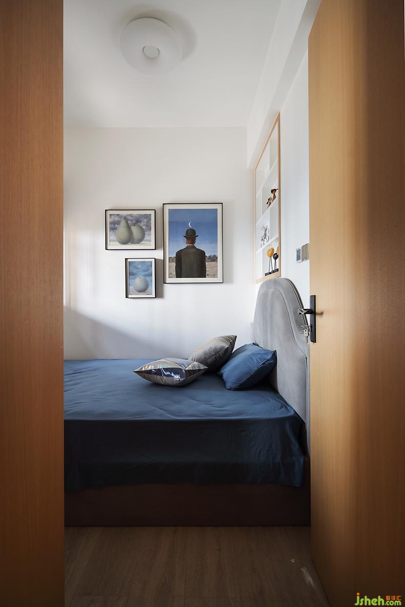 臥室以暖色調為主,靈活運用木色、暖灰和藍色的搭配,打造了一個溫馨助眠的空間。