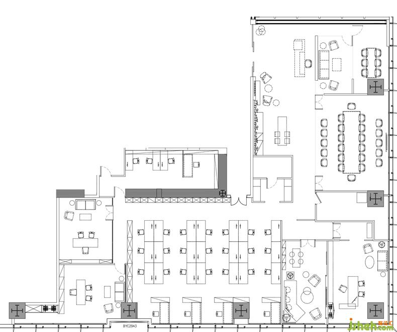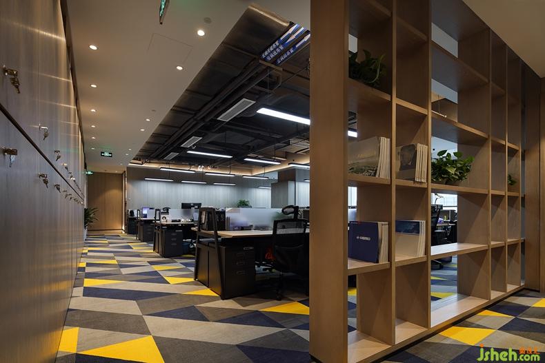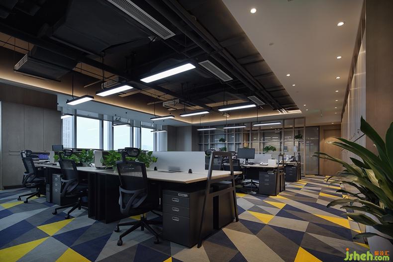 開放辦公區(qū),頂部做了簡(jiǎn)單的吊頂,粗礦的工業(yè)感設(shè)計(jì)與深色辦公桌椅的結(jié)合,象征著沉穩(wěn)與專業(yè)。地毯選用了灰、藍(lán)加色彩鮮明的黃色組合,以菱形紋絡(luò)的形態(tài)展現(xiàn),又給人以創(chuàng)新與活力之感。