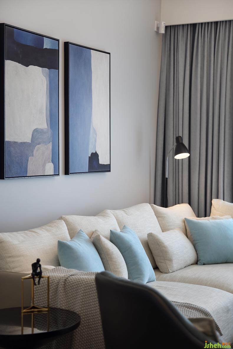 客廳是極簡(jiǎn)的現(xiàn)代風(fēng)格:簡(jiǎn)單的幾何形吊燈、干凈留白的墻壁、溫潤木質(zhì)的地板配上水墨畫一樣的地毯、點(diǎn)綴藍(lán)色抱枕的米色沙發(fā)、還有那欲說還休的壁畫。攝影師推門映入眼簾的便是這般風(fēng)景,讓人覺得一片歲月靜好。室內(nèi)設(shè)計(jì)師