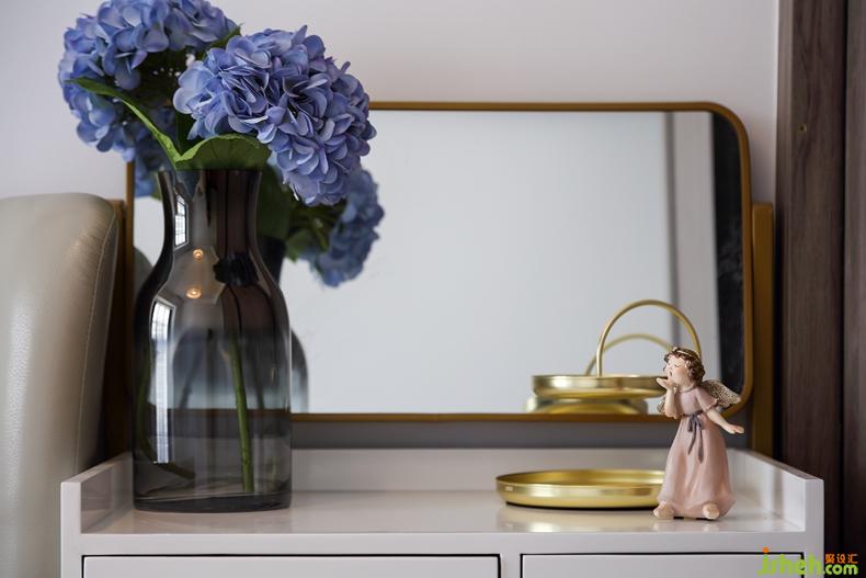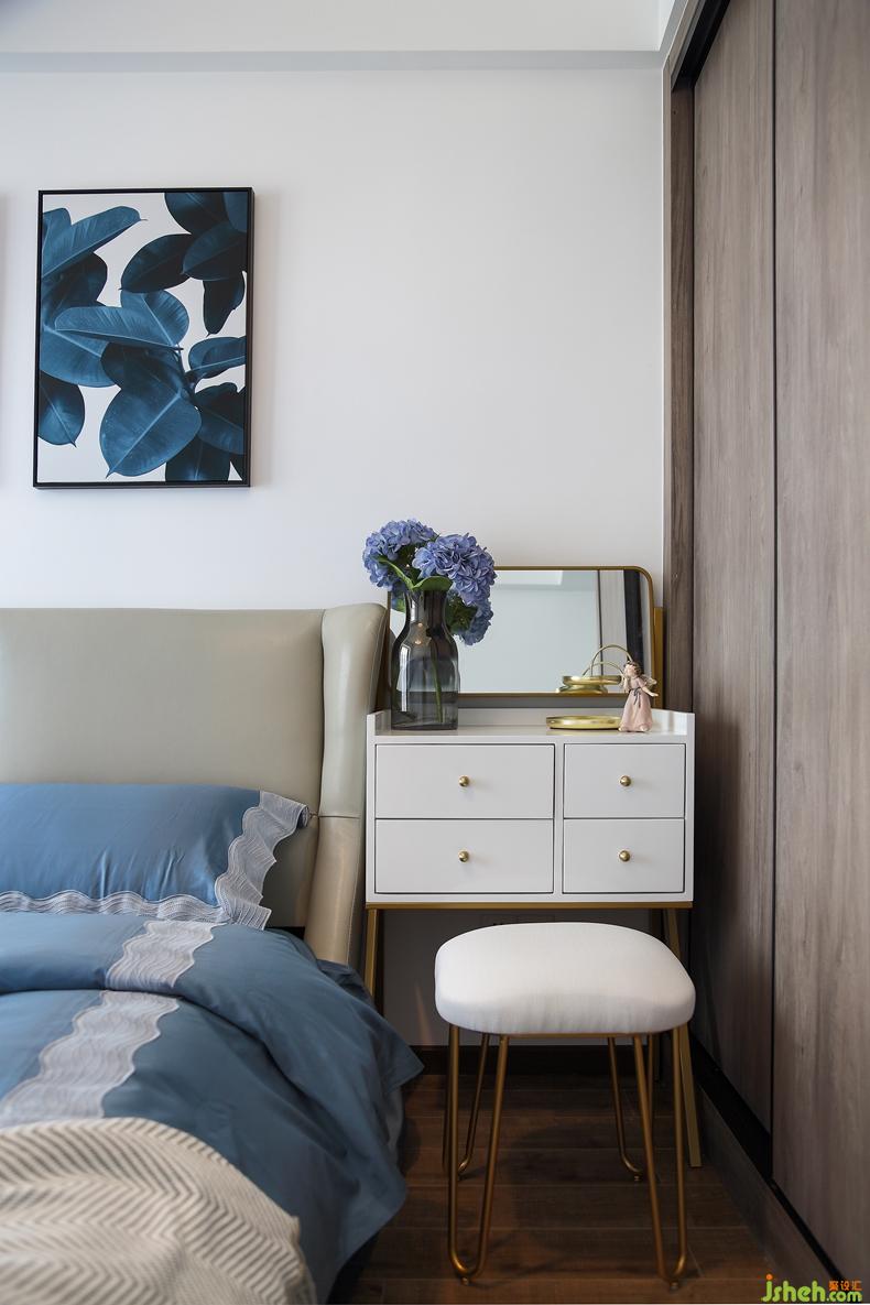 主臥室的陳設(shè)簡單但別具巧思,暖黃色的羽毛式吊燈、背景墻上的寫意掛畫和梳妝臺上的藍色妖姬,色彩及形態(tài)的過渡都別有一番趣味。