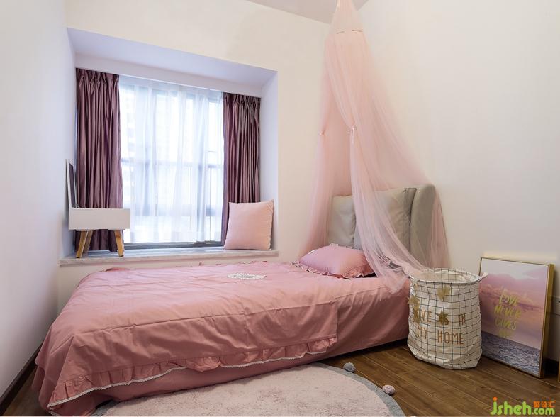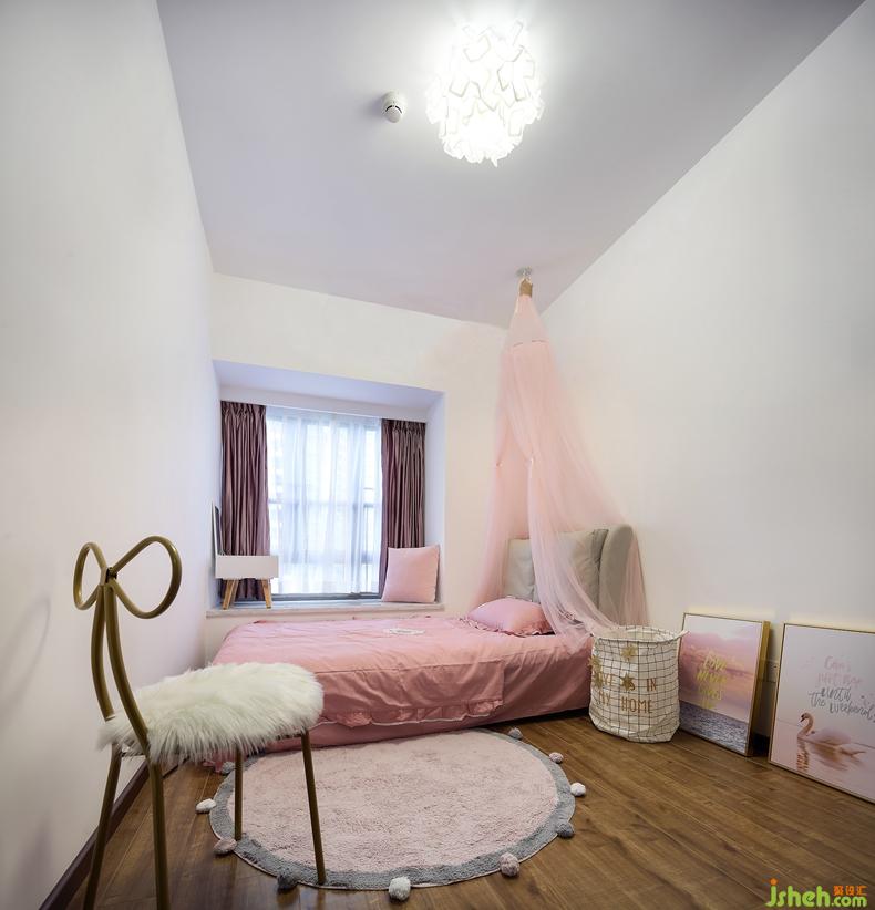 這是一間粉飾的像公主一樣的房間:粉紅床品、粉色三角紗帳、深粉色窗簾、淺粉色毛絨圓地毯……無一不充斥著粉嫩的少女氣息。而精心挑選的小家具又極具設(shè)計感,使空間脫離稚氣。