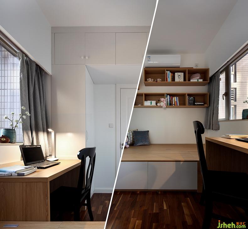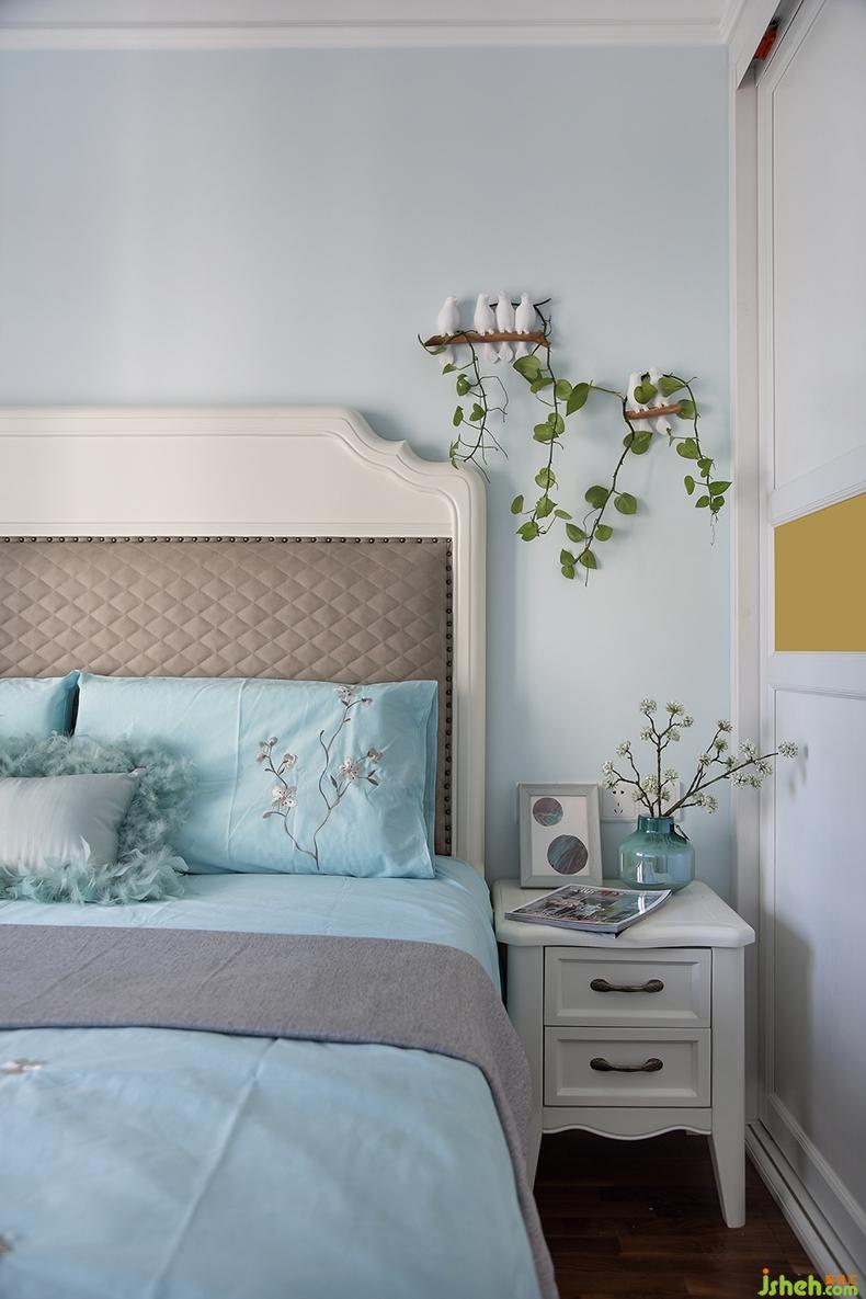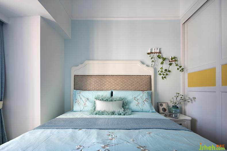 臥室墻面不似客廳的暖米色,而是選用了米白色;地面也鋪滿沉穩(wěn)溫潤(rùn)的木色地板,搭配上藍(lán)綠色的床品,瞬間注入浪漫的基調(diào);床頭用藍(lán)白對(duì)比色也烘托出滿室的溫馨優(yōu)雅。設(shè)計(jì)公司