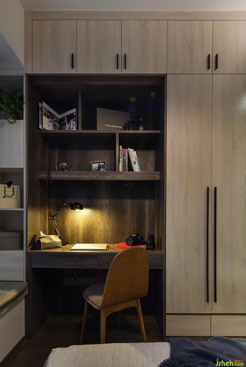 深夜工作可能是大多數(shù)深圳人的常態(tài)了,特意將衣柜的一部分設(shè)計(jì)成書桌,既節(jié)省空間也方便工作。在深色的懷舊情懷中,融入了現(xiàn)代生活的簡(jiǎn)約,一切都恰到好處。