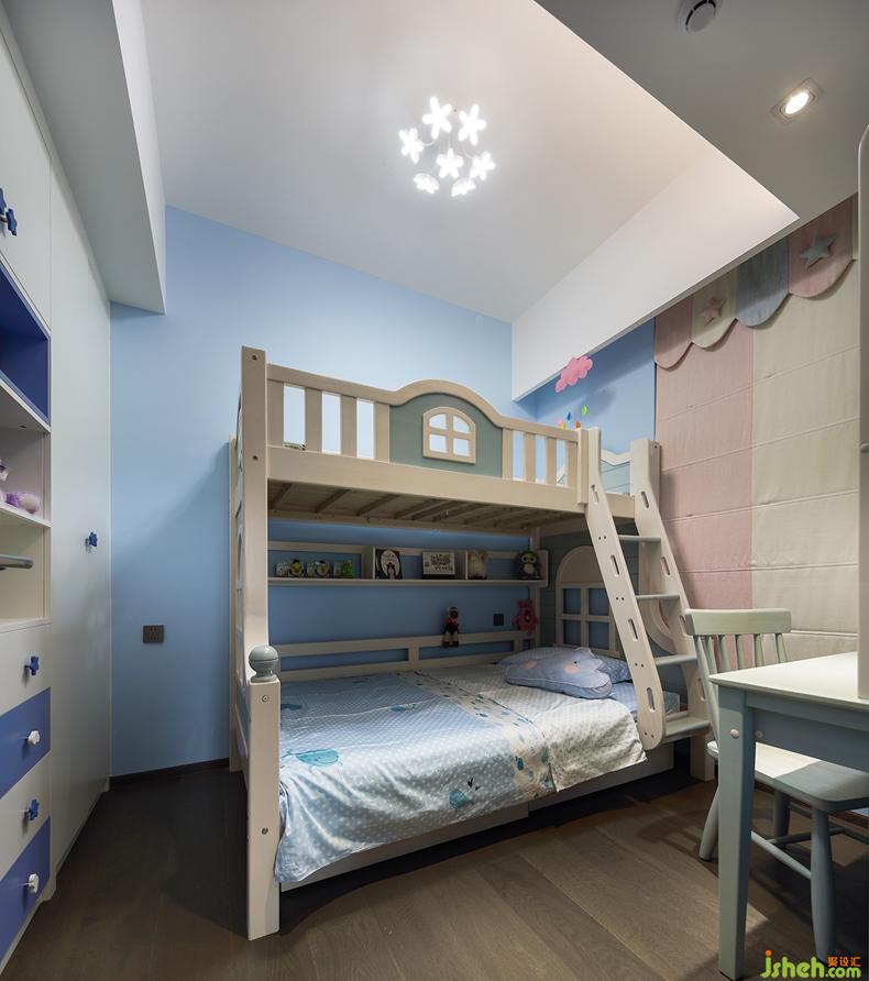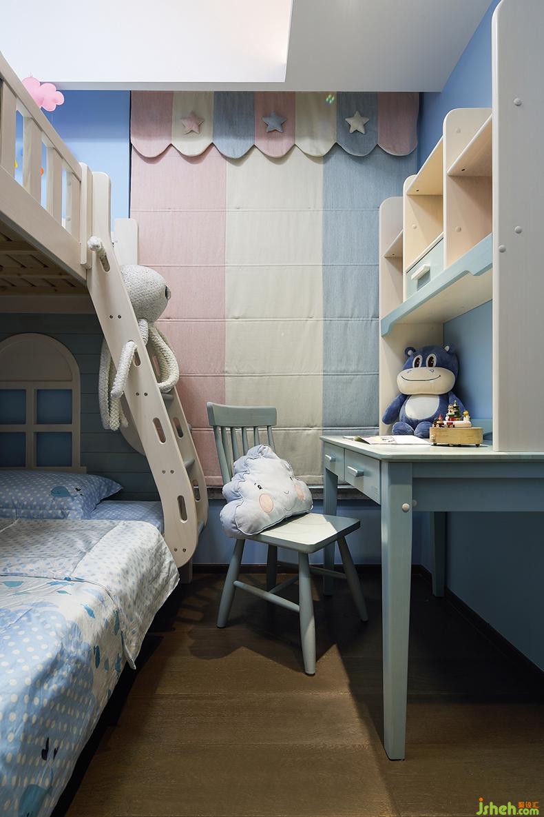 白云藍(lán)天,是自然的呼吸。上下床增加了小朋友的活動(dòng)空間,其造型也很童趣。淺色系的窗簾和書柜,為空間添上另一抹色彩,整個(gè)空間變得很和諧。