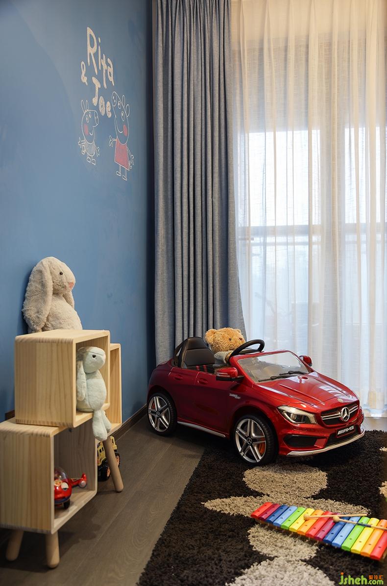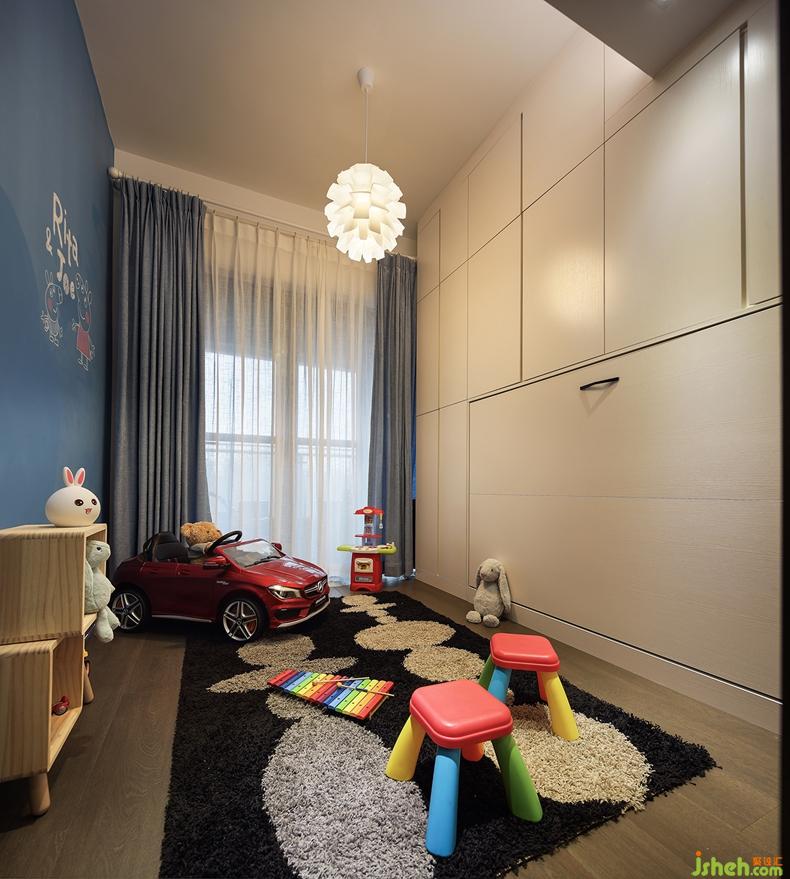 儲(chǔ)物間將一面墻做成藍(lán)色,既能涂鴉又考慮到孩子的視覺感受;對(duì)面是米白色的隱藏式柜子,增加儲(chǔ)物空間,既美觀又實(shí)用。設(shè)置一道玻璃推拉門,將陽臺(tái)和儲(chǔ)物間打通,便于通風(fēng)采光。