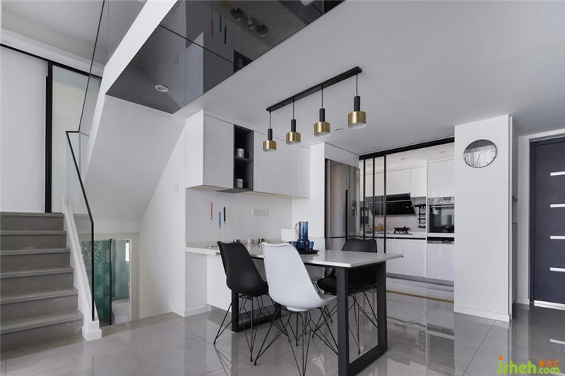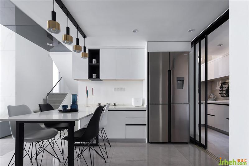 延續(xù)了黑白色調(diào)的搭配,半開放式的廚房也可完美融入公共區(qū)域,擴大視覺空間感。而無論透過玻璃門的是燈光還是日光,都能營造享受烹飪的氛圍,讓廚房充滿煙火氣。