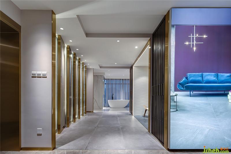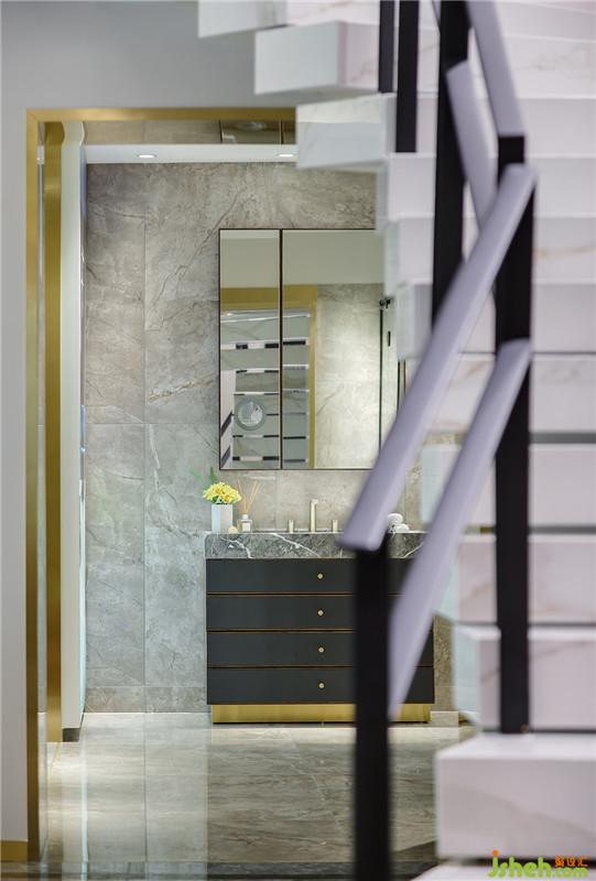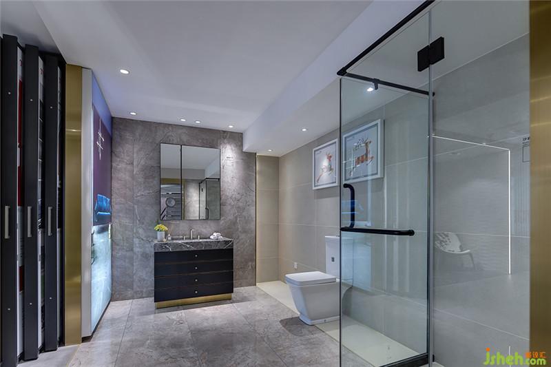 進(jìn)入產(chǎn)品展示區(qū)二,映入眼簾的,是散發(fā)著柔光的玻璃淋浴間和灰色素雅的瓷磚墻,借著洗漱盆上照映的燈光,仿佛能看到洗浴后圍繞的熱氣,混著沐浴的香氣,絲絲入鼻。