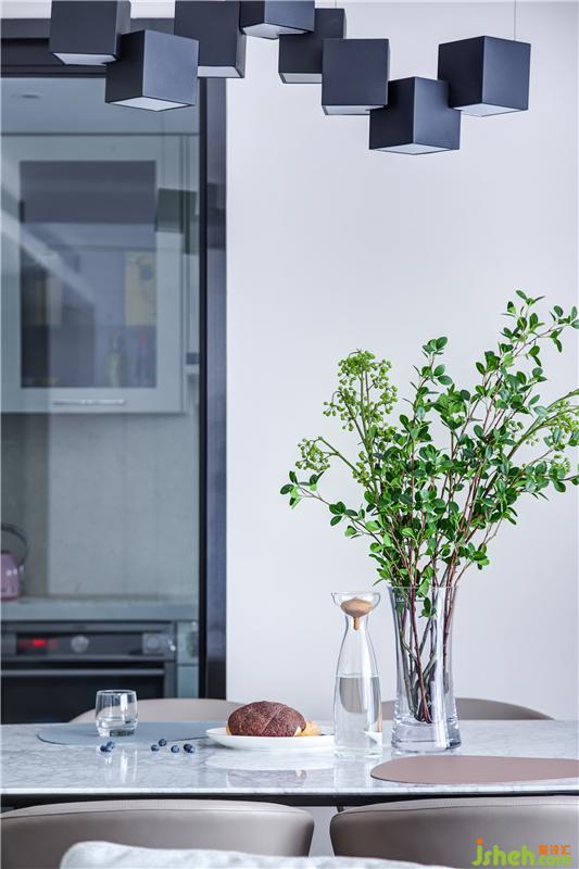 白色大理石臺(tái)面餐桌與米咖色皮質(zhì)餐椅可謂是絕佳結(jié)合,無論是色彩上的和諧過渡還是材質(zhì)上的剛?cè)岵?jì),都恰到好處。而精心挑選的組合分子吊燈則是營(yíng)造空間氛圍的高手,其特有的表現(xiàn)力讓空間一秒變得時(shí)尚而有趣。再擺上一盆清新的綠植,空間更顯溫馨和活力。