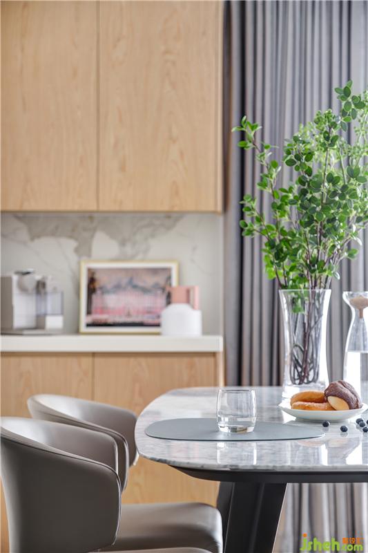 餐廳緊靠窗簾位的一側(cè)定制了木色餐邊柜,因其厚度遠(yuǎn)大于窗簾盒厚度,到頂?shù)脑O(shè)計(jì)會(huì)造成與天花的收口問題,便根據(jù)現(xiàn)有寬度進(jìn)行了鏤空的造型處理。臺(tái)面和中空位則選用巖板帶過,其紋理清晰、富有層次感,色澤又帶有細(xì)微的明暗變化,給人一種高貴、雅致的感覺。溫和的木色與鏤空的造型和電視背景墻巧妙呼應(yīng),讓人不禁感嘆:環(huán)環(huán)相扣。室內(nèi)設(shè)計(jì)師