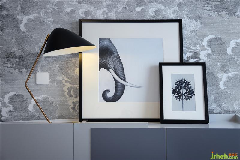 床尾是整面的自然系列網(wǎng)紅墻紙,云朵圖案極度逼真,充滿巴洛克式的超現(xiàn)實(shí)風(fēng),浪漫又別具一格。輔之以造型獨(dú)特的五金臺(tái)燈和黑白凈色生態(tài)系掛畫,過濾掉一切復(fù)雜的色彩,越發(fā)烘托出室內(nèi)佼佼不群的優(yōu)雅氣息,讓人得以在喧囂日常中抽身出來,覓得自己的一方清凈之處。