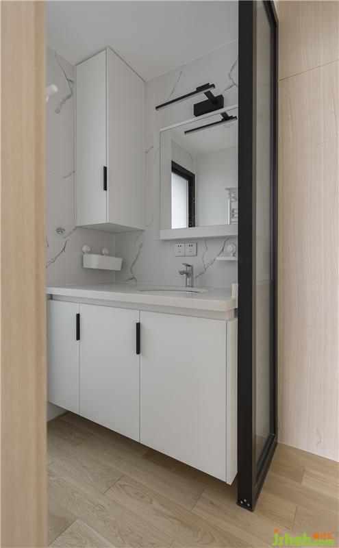 衛(wèi)生間將洗手臺外置,提高了日常使用效率。黑白色調(diào)的浴室柜與大理石墻磚的紋理相呼應(yīng),視覺上營造了延伸的效果。