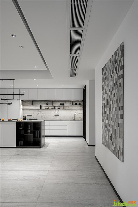 黑色鋼條與大理石、烤漆板和瓷磚之間的體塊穿插和組合讓空間更有趣味,同時也便于業(yè)主及時看到入戶情況,而從外往里看則會覺得內(nèi)有乾坤,空間更有延伸感。
