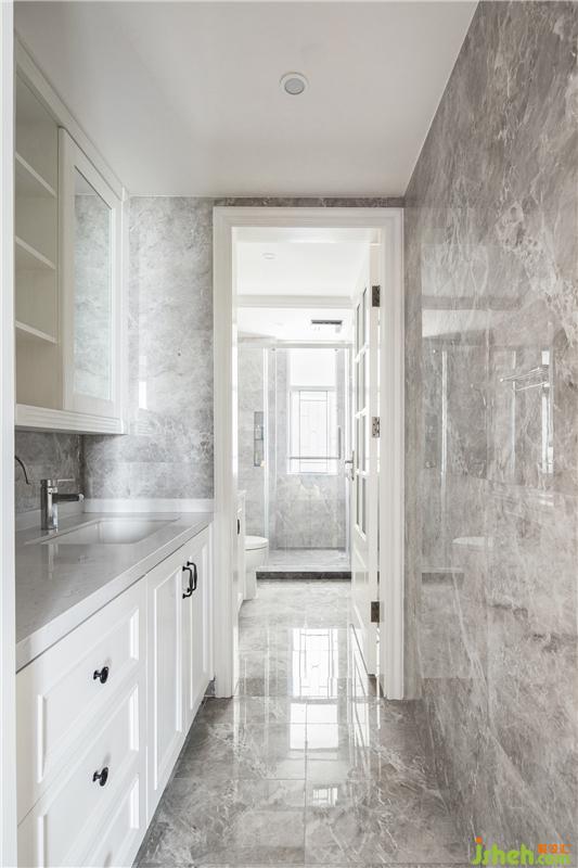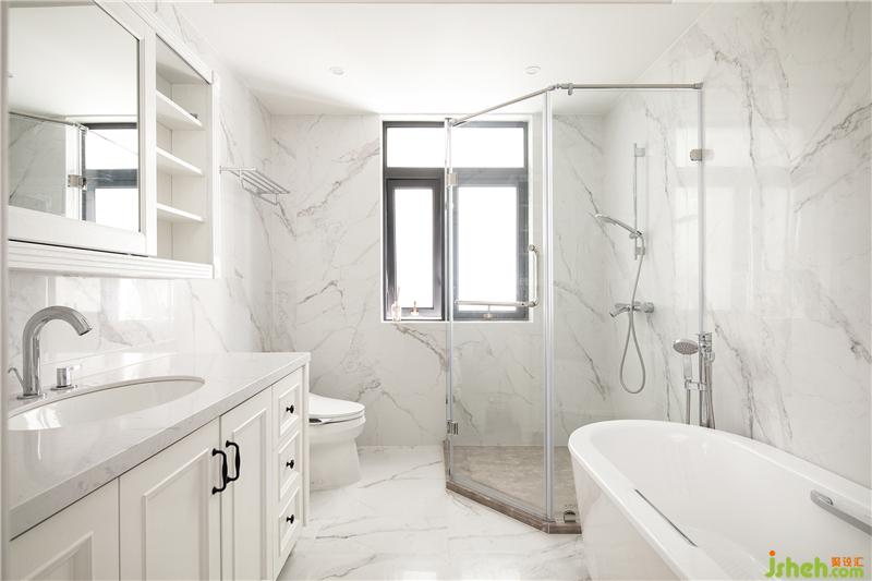 主衛(wèi)墻面鋪貼大尺寸的大理石紋白色瓷磚,地面延續(xù)大理石紋的款式,浴室柜則選用醒目亮眼的白色,讓衛(wèi)生間更顯通透、大氣、明亮。