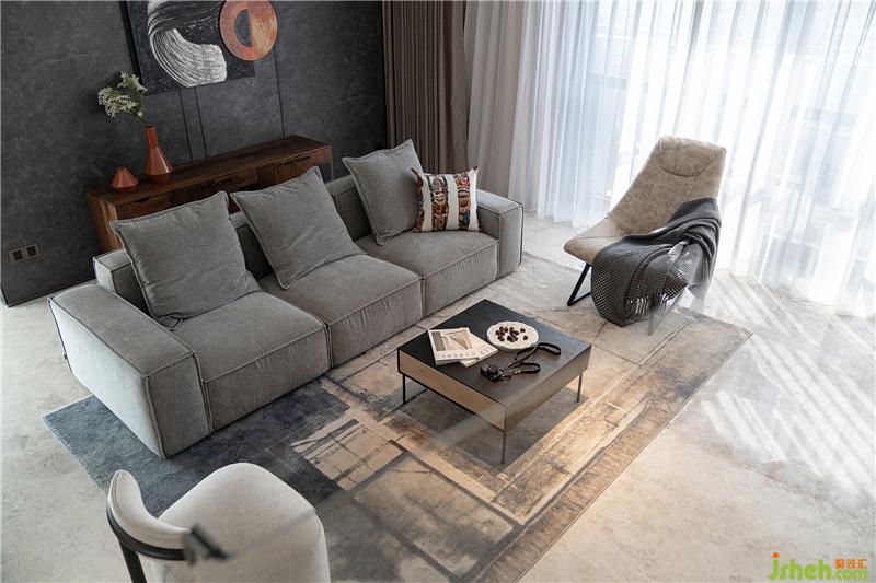 暖灰色布藝沙發(fā)和深色木制儲物茶幾、暖白色休閑椅相當搭配,款式新穎又休閑舒適,充滿美好且文藝的氣息。