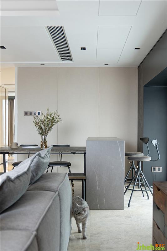 客廳選擇了較多質感柔軟、細膩的家具,給室內增添溫馨、舒適的感覺,同時,中和了冷硬的地面與背景墻,展現(xiàn)出工業(yè)風的獨特美感。
