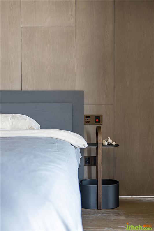 主臥家具以高級灰質感為主,靜謐的色調也使空間充滿寧靜的氣息。床頭背景墻改造成了整面水洗秋香木紋的護墻板+隱形門,令空間更加平衡,既有工業(yè)風的粗獷感,造型又很簡約,與現(xiàn)有裝修基礎完美融合。