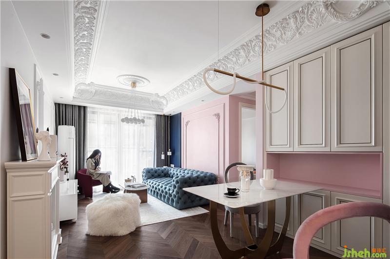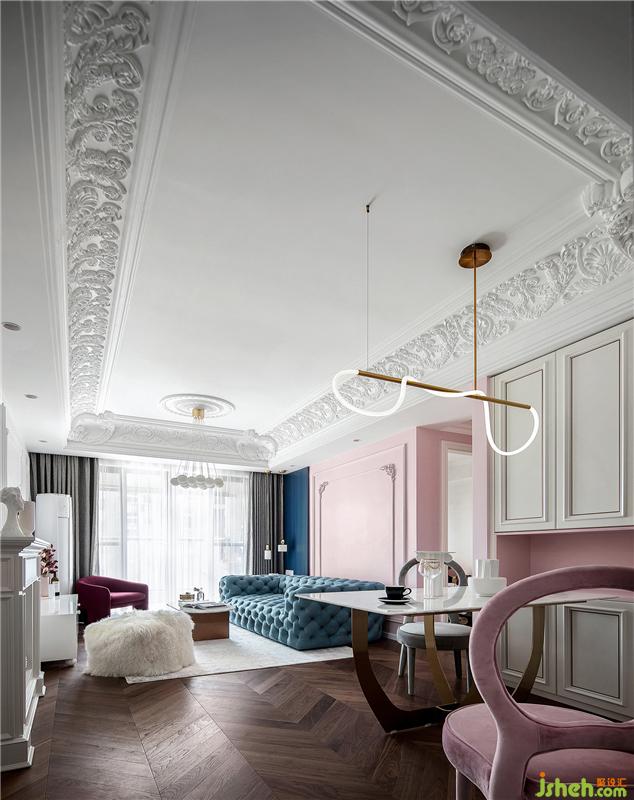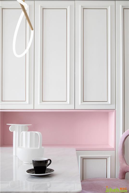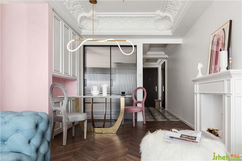 餐廳與客廳相連,為了保持通透、舒適的空間感,僅在一側(cè)定制了到頂?shù)牟瓦吂?,款式和色調(diào)均同客廳相呼應(yīng),以臟粉色作為跳躍色,古銅色作為點(diǎn)綴色,延續(xù)整體法式輕奢的格調(diào)。