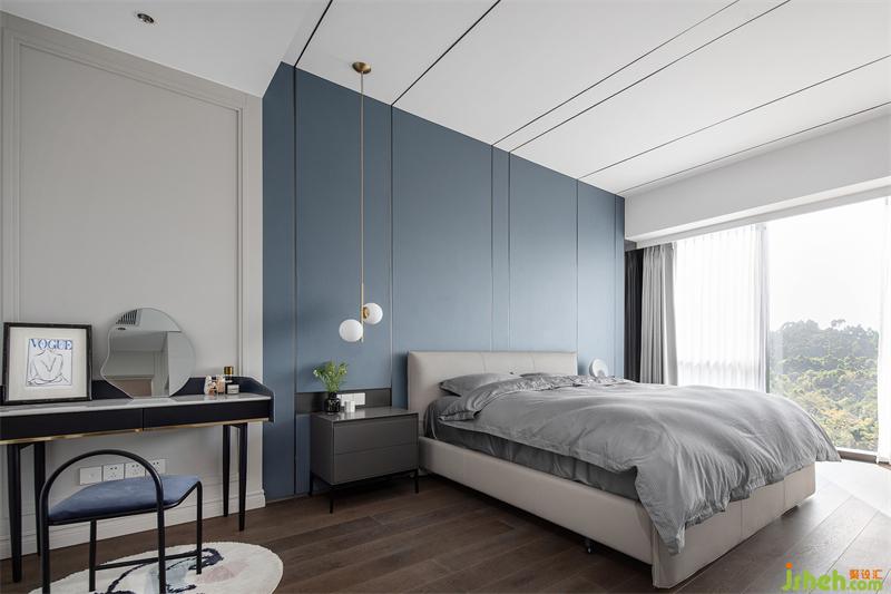 主臥延續(xù)霧霾藍(lán)的主色調(diào),以整面硬包+不銹鋼作為床頭背景墻,一派沉穩(wěn)靜謐之感。墻面不銹鋼更是順勢(shì)延伸至天花頂面,巧妙成為裝飾造型,令空間在視覺(jué)上更有延展性。