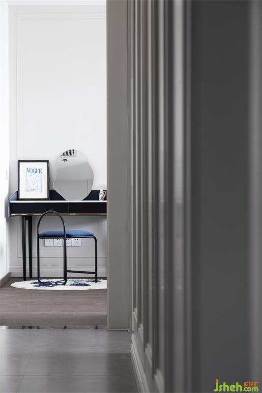 梁位下以溫柔的奶茶色木飾面為界,加設(shè)了女主人的梳妝臺(tái),豐富空間功能性。異形梳妝鏡和小掛畫(huà)相互呼應(yīng),使空間更具靈動(dòng)性。
