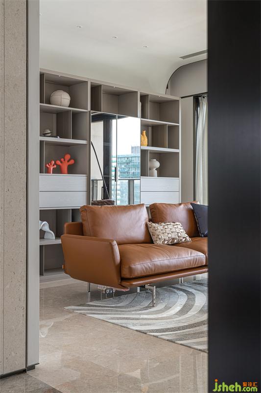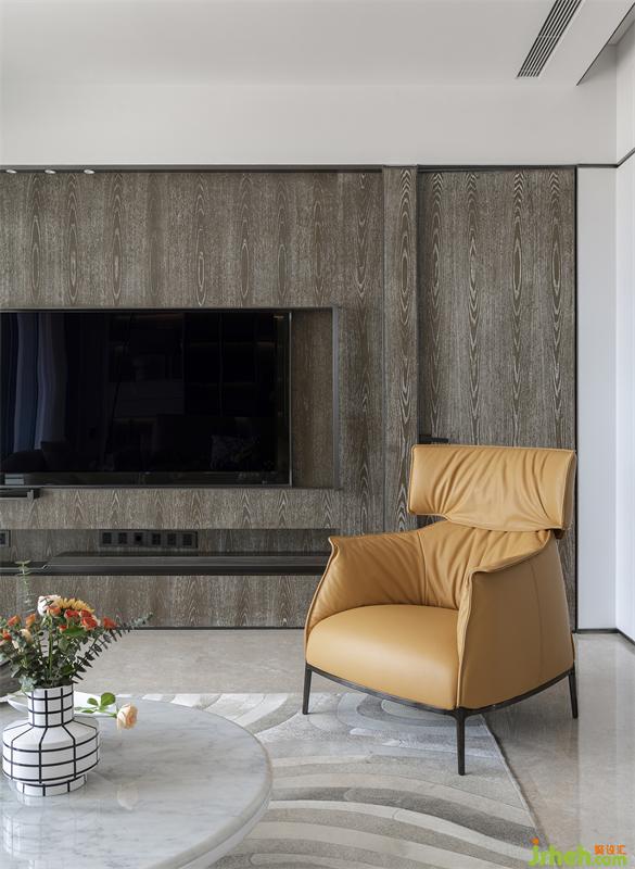軟裝搭配在材質(zhì)、色彩的選擇上與硬裝風(fēng)格一致,選用Poliform和Poltrona Frau的沙發(fā)組合,勾勒出家的溫馨舒適感。而玉米黃和琥珀棕的介入更是將家的大氣、高級、意趣體現(xiàn)得淋漓盡致。