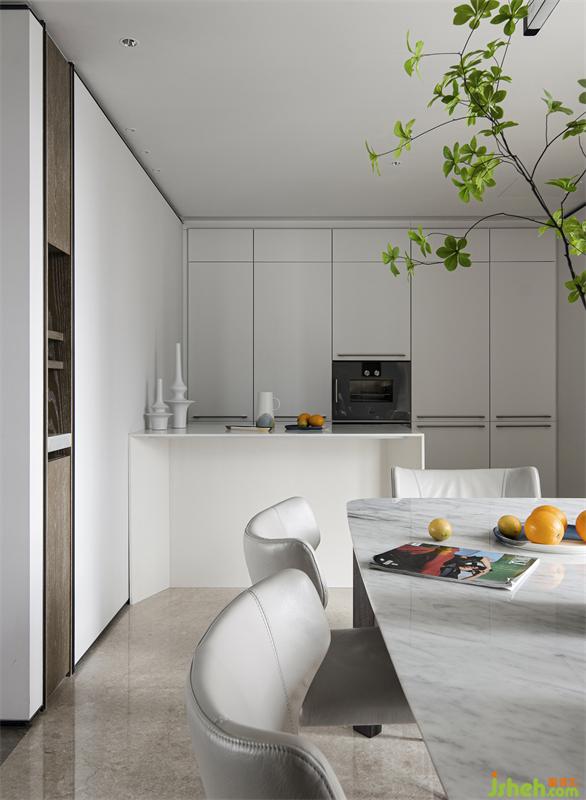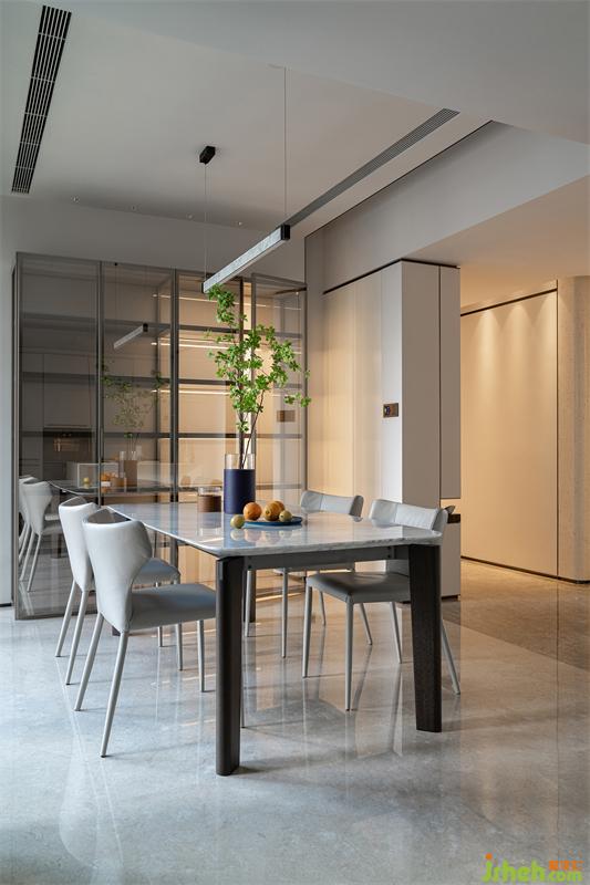 柔光瓷磚的細(xì)膩與奶油白精裝基礎(chǔ)達(dá)到美感平衡,更深層次的質(zhì)感則由家具凸顯。深圳豪宅設(shè)計(jì)餐廳選用B&B餐桌搭配Natuzzi餐椅,造型簡(jiǎn)約干練,色調(diào)內(nèi)斂高級(jí)??繅σ粋?cè)加設(shè)兩組四面鏡面玻璃酒柜,通透的材質(zhì)增加了空間延伸感,同時(shí)豐富了儲(chǔ)物空間。