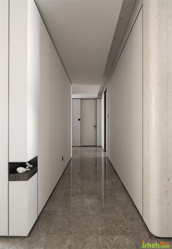 折角白色天花吊頂鋪墊簡(jiǎn)潔利落的氣質(zhì),特意留出一側(cè)筒燈位置,見光不見燈,深圳豪宅設(shè)計(jì)以燈光效果營(yíng)造空間深度情景氛圍。