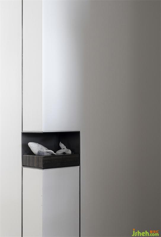 玄關(guān)端景選用Poltrona Frau玄關(guān)柜搭配Joel Amit彩色魚群藝術(shù)畫,使回家的第一視覺感便是五彩斑斕的,活躍的色彩令人心情愉悅,涌動(dòng)著年年有余、吉祥如意的美好寓意。