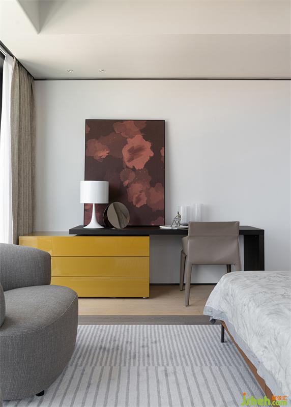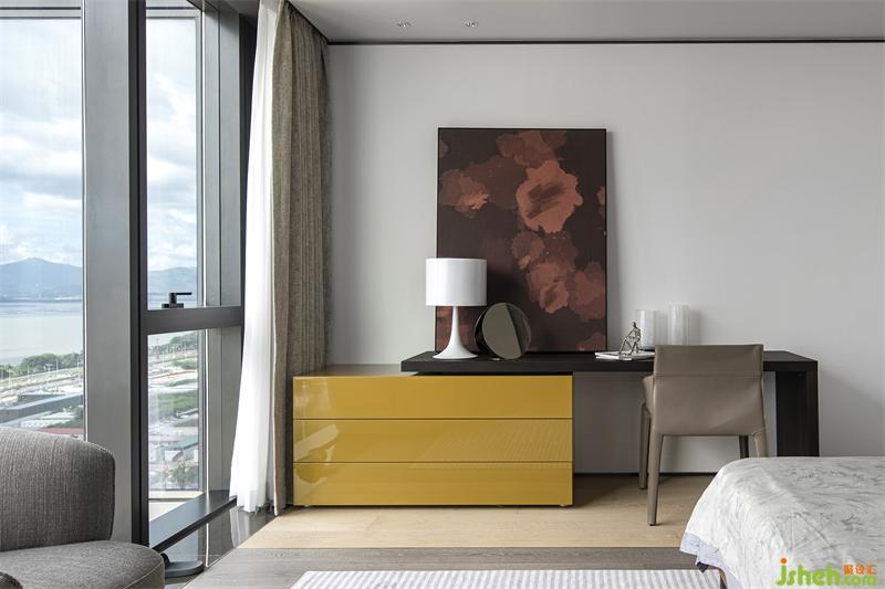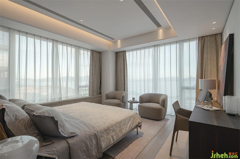 主臥擁有絕佳的采光和視野,深圳豪宅設(shè)計(jì)以暖色為基調(diào),搭配Poltrona Frau床和沙發(fā),圓潤(rùn)的造型與硬朗的懸浮天花形成對(duì)比,剛?cè)岵⑷胪昝廊诤希瑑?yōu)雅精致的質(zhì)感彰顯高級(jí)溫柔格調(diào)。