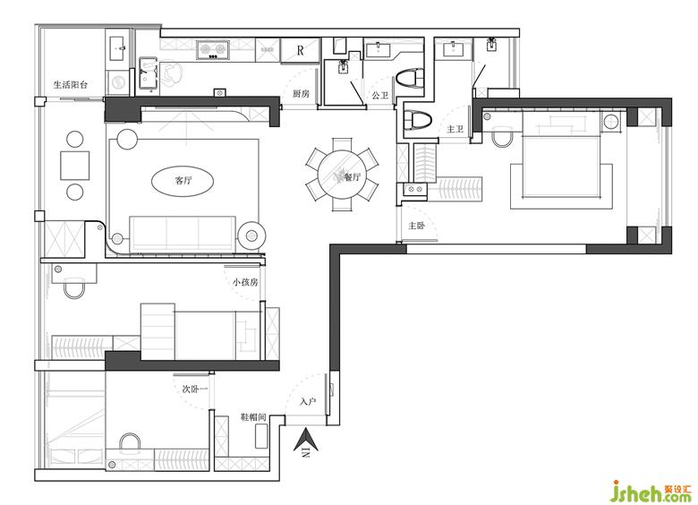?打通主臥與客餐廳連接的兩面墻,對(duì)調(diào)原臥室和客廳,實(shí)現(xiàn)客餐廳一體。同時(shí)在滿(mǎn)足兒童房重構(gòu)空間尺寸的基礎(chǔ)上,盡可能擴(kuò)大客廳空間。