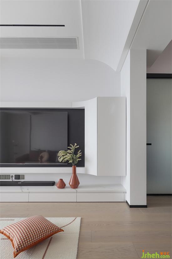 為避免弧形造型的單一生硬,在橫梁、立墻、背景中也多處使用相同圓弧造型,修飾了梁,也形成了家中特有的元素——圓潤(rùn)的細(xì)膩美感!