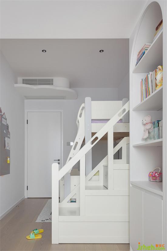 兒童房的落地窗區(qū)域也由原來陽臺外拓而得,高低床、衣柜、書柜一列式的排布,為兒童房創(chuàng)造了學習區(qū)、娛樂區(qū)和休息區(qū),功能齊備也不局促,家裝設(shè)計雖然原有天花梁位很低,但小小的半片云朵擱板遮擋,恰巧解決了中央空調(diào)的實力搶鏡,還給兒童房增添了一絲童趣。