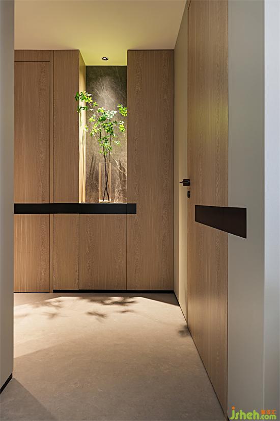 過道采用儲物柜填充凹陷部門,增加收納功能。柜門統(tǒng)一配上黑色腰線,與房門向外拓展至墻面的黑色腰線相呼應(yīng),這個過道簡直太愛了!