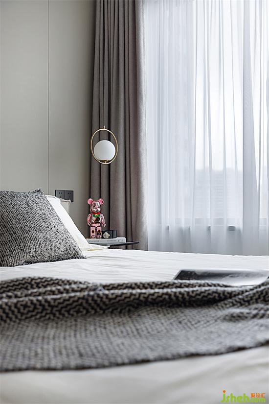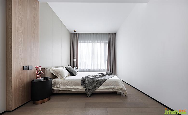 臥室同樣是無主燈設(shè)計,僅用燈帶結(jié)合單側(cè)吊燈予以裝飾,床頭背景延續(xù)公共區(qū)域的滿墻護墻板設(shè)計,干凈利落。整個臥室空間仿佛洗卻所有生活的條條框框,灑脫自如地躺在床上,盡情放松就是啦~