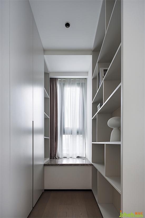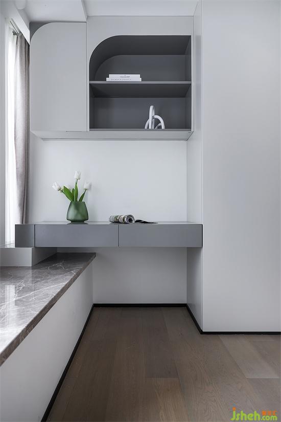 整墻衣柜連接書桌書柜以實用性為主,白色搭配全屋灰色主調(diào),并在造型上延續(xù)整屋弧形元素,使得空間更具整體感。