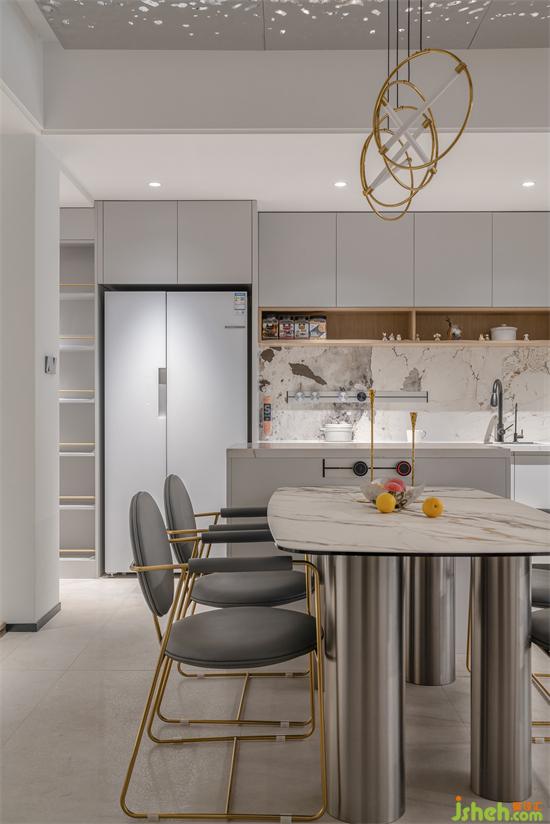 送走了白日喧囂,夜晚時(shí)刻的佳肴擺放在島臺(tái)上等待家人的歸來(lái)。島臺(tái)的加入讓餐廳的顏值提高了不少,臺(tái)面足夠?qū)挸ǎ瑯O簡(jiǎn)設(shè)計(jì)顯得小眾又高級(jí),在金屬架的吊燈的映照下,把一日三餐的氛圍烘托的剛剛好。