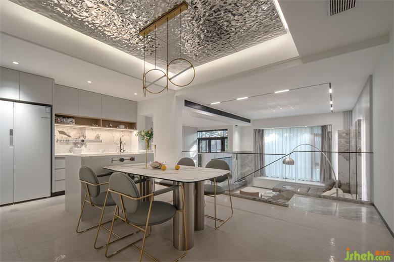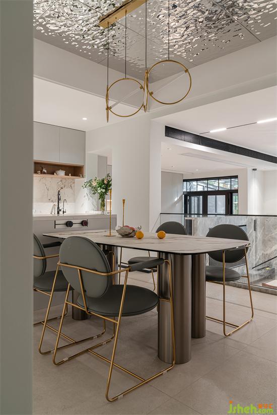 在這里隨處可見(jiàn)元素拼接呼應(yīng),淺色系的應(yīng)用更是讓餐廳視覺(jué)上顯大。天花的水波紋板使暖暖的燈光鋪滿整個(gè)空間,彌補(bǔ)了餐廳光線不足的問(wèn)題。在光的反射作用下,Baxter餐椅的黃銅框架熠熠生輝,燈光柔和不刺眼,餐椅造型極致簡(jiǎn)約,盡顯輕奢大氣!