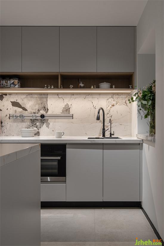 生活的質(zhì)量還得看廚房的格調(diào)。以冰箱為界限,里側(cè)是中廚區(qū),外側(cè)是西廚區(qū),涇渭分明又一氣呵成。西廚區(qū)灰色烤漆的櫥柜,讓整個(gè)廚房顯得更加干凈。功能劃分明確,同時(shí)增加了許多收納格,整體素雅、高級(jí)、有質(zhì)感。