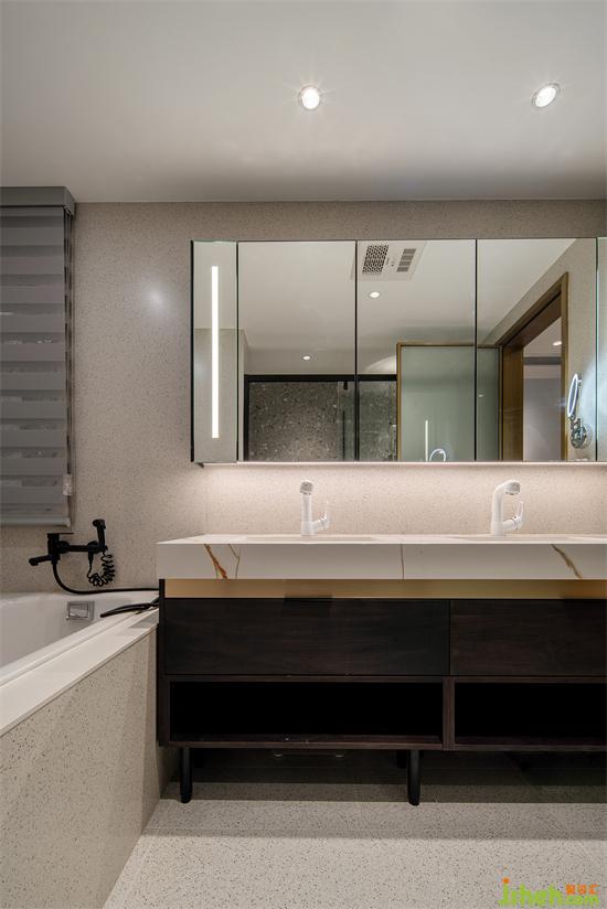 一眼萬(wàn)年的雙臺(tái)盆主衛(wèi),對(duì)稱的設(shè)計(jì)美觀大氣,乳白色巖板搭配深色系木質(zhì)收納柜,呈現(xiàn)出飽滿的質(zhì)感和豪華感。