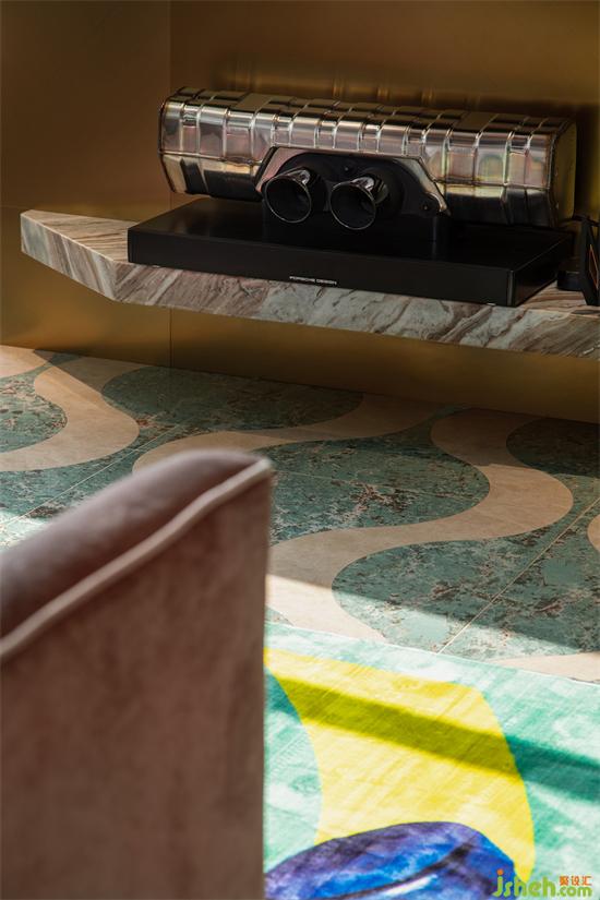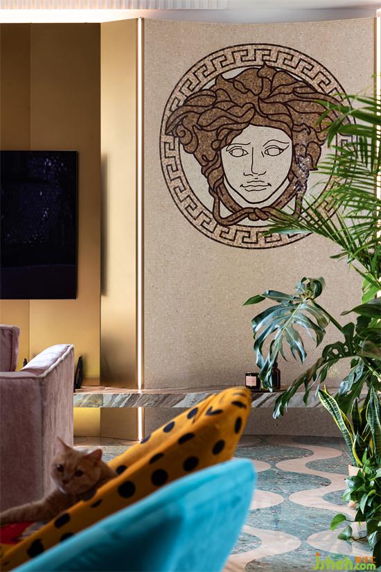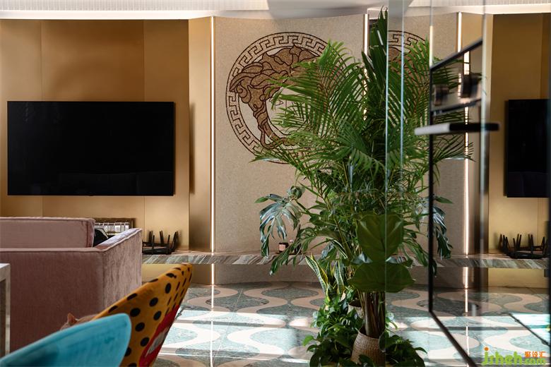 客廳的另一端,是富有小心機的電視背景墻。金屬材質手感細膩不易沾灰,搭配斜面、弧形的元素,穿插式設計令背景墻更加生動立體。家裝設計個性化的VERSACE拼花彰顯獨特的異域風情,更傳遞著風格鮮明、致命吸引力的濃厚藝術寓意。