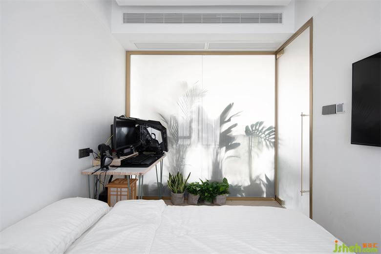 綠植蔥郁掩護之下,走進一瞧才發(fā)現(xiàn),客廳里竟然還藏了個客房!因為平時使用頻率不高,砌實墻不僅占用空間還影響采光,索性選用電動霧化玻璃做隔斷!日常保持通透狀態(tài),完美與客廳融為一體;使用時有遮擋效果,隱私性得以保障,perfect!