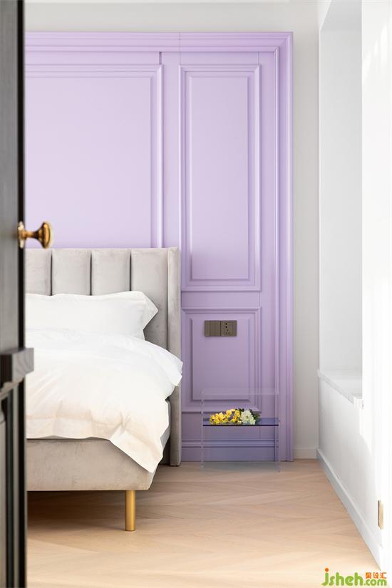 小姐姐希望主臥跟公共區(qū)域有明顯區(qū)分,進入臥室要有放下一切煩惱的舒適感。于是,設計師在主臥的設計上刻意簡化裝飾感,以仙女標配色——香芋紫作為空間的主色調(diào)!床頭背景是一面香芋紫色輕法式護墻板,搭配漸變色極簡亞克力床頭柜和高級灰高背軟包床,材質(zhì)軟硬結合,色調(diào)相輔相成,在懸浮吊頂和周邊燈帶的映照下,共塑一室溫柔。