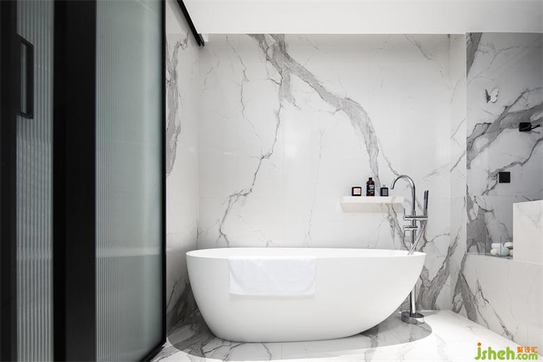白色落地式獨立浴缸搭配銀色潔具,純凈中透露著高級感。墻面加設巖板置物架,洗浴用品可以隨手擱置,便捷又實用。