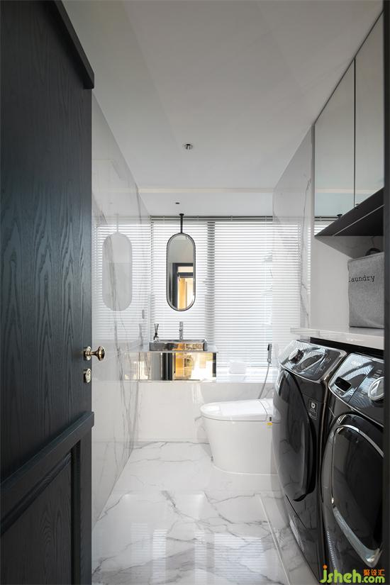 主衛(wèi)的地面和墻面均采用連紋雪花白巖板,洗手臺則是同材質(zhì)一體式定制設計,無形中引導視線延伸,使得空間感得以擴大,品質(zhì)感也大大提升。