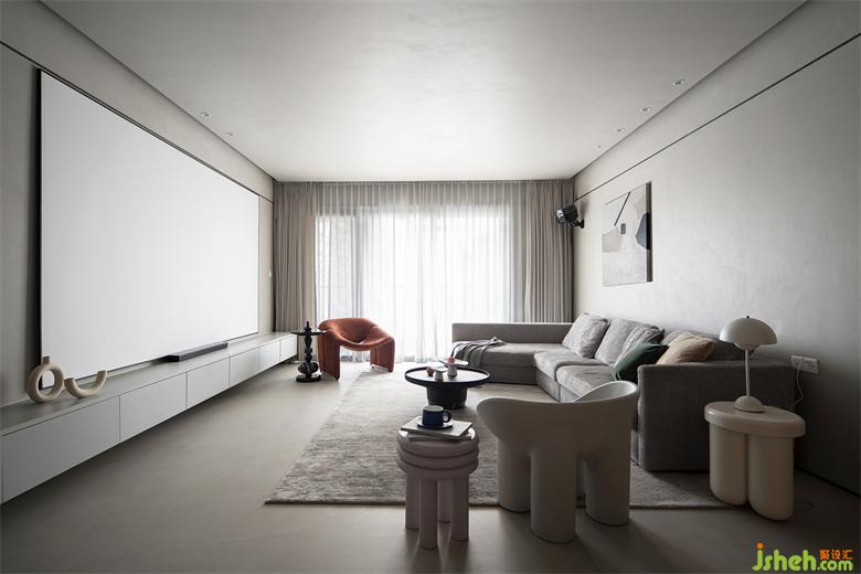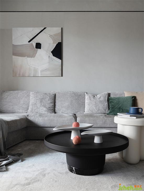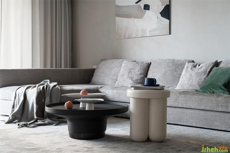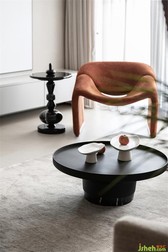 臟橘色點(diǎn)綴為現(xiàn)代簡(jiǎn)約的家?guī)頃r(shí)尚氛圍,圓形桌更是給嚴(yán)肅設(shè)計(jì)帶來一絲活潑跳躍之感。家裝設(shè)計(jì)使用弧形元素貫穿整個(gè)客廳,加之不同形狀幾何軟裝的疊化設(shè)計(jì),弱化水泥色帶來的嚴(yán)肅感,反倒給這個(gè)家?guī)頊剀案杏X~