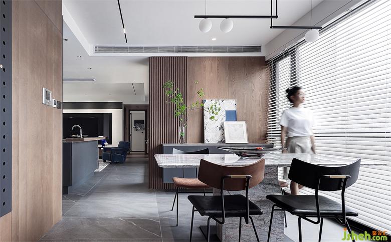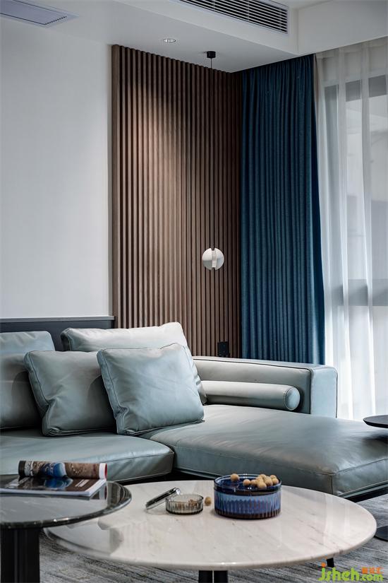 以Y先生最喜歡的深海藍(lán)為基調(diào),搭配沉穩(wěn)、酷雅的深灰色和木色,選用烤漆、大理石、木格柵和絨布等多種材質(zhì),打造極具高雅格調(diào)的現(xiàn)代極簡空間。