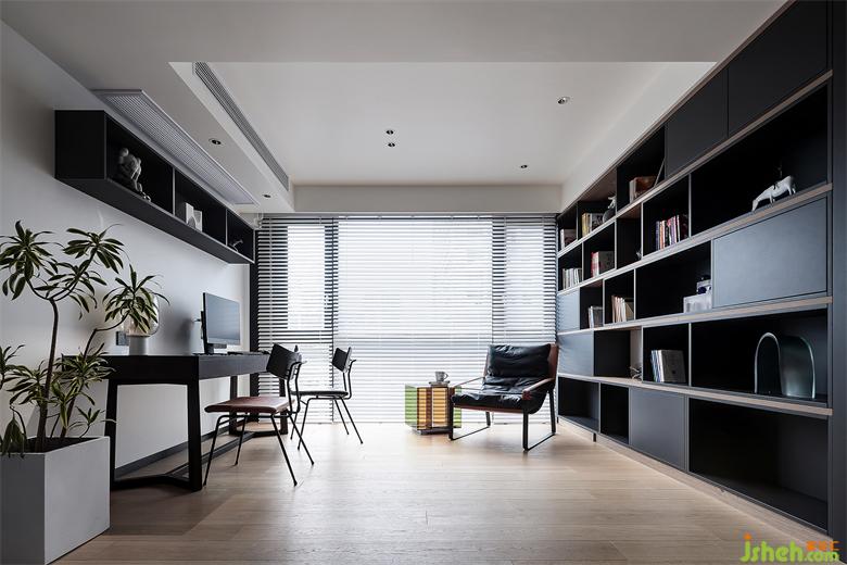 從沙發(fā)起身,邁上一個小臺階,進入書房。家裝設計透過百葉簾的陽光為空間加上了柔光特效,目之所及皆軟和。