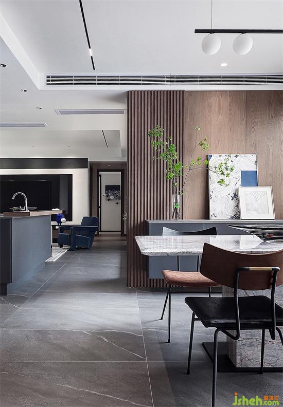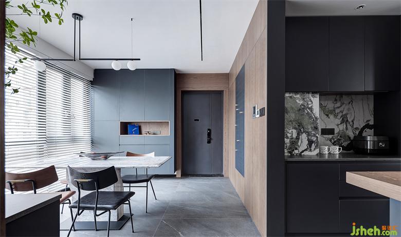 與入戶鞋帽間相輔相成的是一排到頂、底部懸空的餐邊柜,以深灰色為主,為餐廳注入了沉穩(wěn)的力量感,也滿足了餐廳的收納需求;