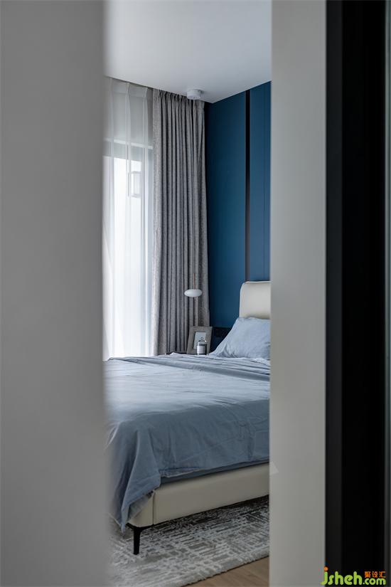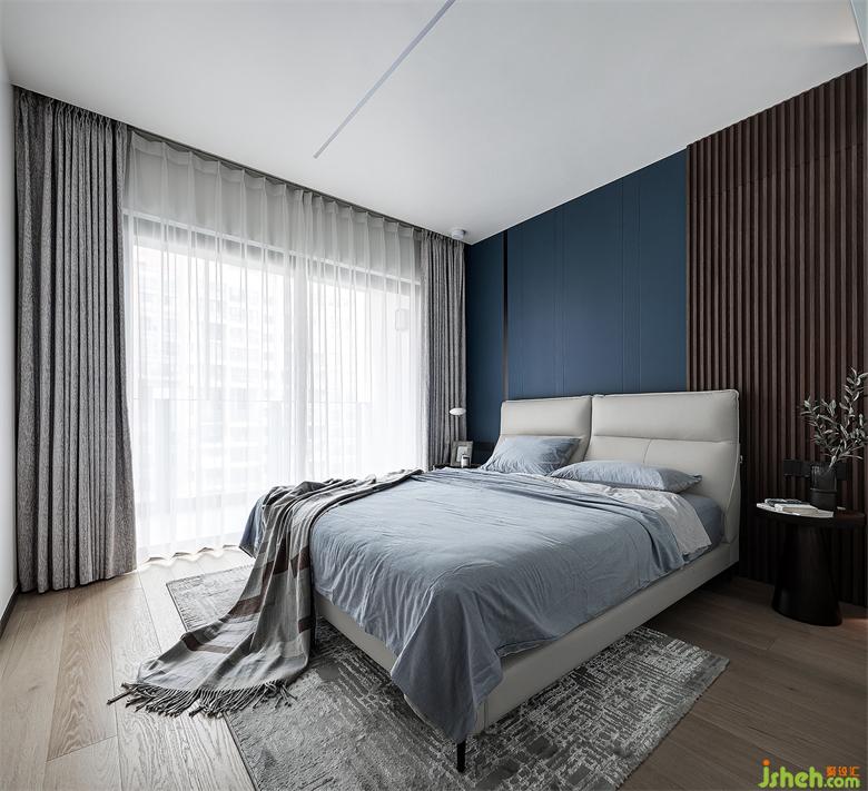 深海藍皮質硬包、黑色不銹鋼、木格柵,延續(xù)客餐廳的主要用材,復刻的設計手法令主臥更平衡、和諧。